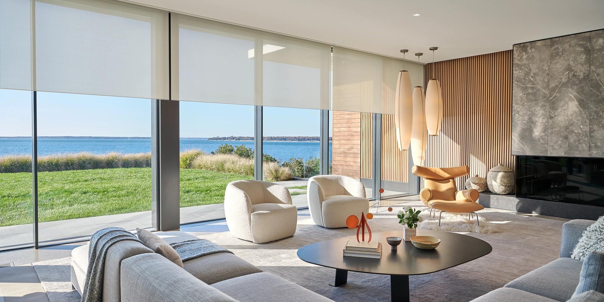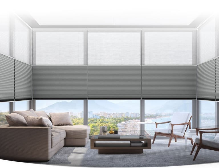Paneles deslizables o plisados para ventanales amplios y estilo fluido.